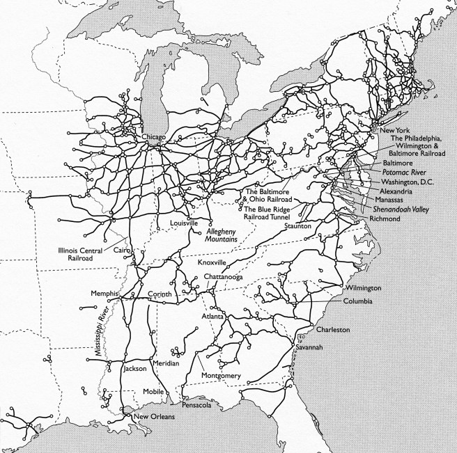 Map of American Railroads and major junctions in 1861. (Thomas, The Iron Way)