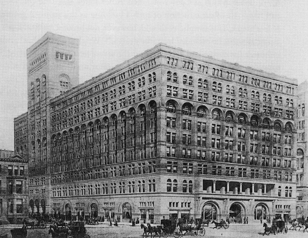 Left: George B. Post, Mills Building, New York, 1881. (Online); Right: Burnham & Root, Rialto Building, Chicago, facing Van Buren, 1883. (Hoffmann, Root)Left: George B. Post, Produce Exchange, New York, 1880. (Online); Right: Adler & Sullivan (with William Ware), Design for the Auditorium, April 1887. (Siry, The Auditorium)