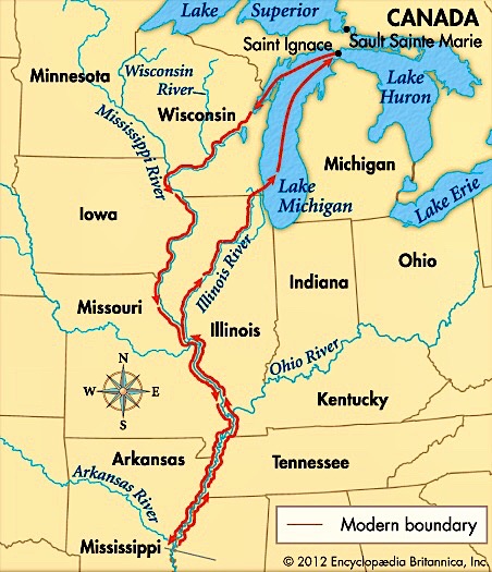 On May 17, 1673, Marquette, accompanied by voyaguer (a seasoned transporter of furs via canoe) Jolliet, set off from St. Ignace to explore the Mississippi Valley to determine whether it was the fabled Northwest passage. They took a route from Mackinac to the Mississippi, via the Wisconsin River, a route first traversed in 1634 by Jean Nicolet, another early voyaguer. They reached the Mississippi on June 17, 1673, and then traveled down the river for over a month until they reached the mouth of the Arkansas River. Here they learned from the local Native inhabitants not only that the river did not turn west to the Pacific, but also if they continued any farther south unfriendly Natives and Spanish soldiers (who had been exploring the lower Mississippi Valley for more than 130 years prior to the French expedition, starting with the Spanish explorer Hernando de Soto who in 1541 had first crossed the Mississippi River into northern Mississippi) could intercept them if they continued any farther. Therefore, Marquette and Jolliet reversed their course and headed back to Lake Michigan, returning in the fall of 1673. On their return they were directed by local Natives to take what is now the Illinois River back to Lake Michigan as a shorter route than from which they had started. After traversing up the Illinois River to its head at the confluence of the Des Plaines and Kankakee Rivers, they then followed the Des Plaines for some thirty-five miles, until they were led, via a short portage to a sluggish stream, the Chicago River that emptied into Lake Michigan.