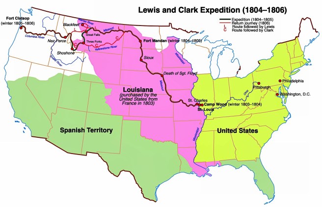 Meanwhile, during the final negotiations over the Louisiana Purchase, President Jefferson was planning an expedition led by Capt. Meriwether Lewis and Lt. William Clark to discover “the most direct and practicable water communication across this continent, for the purposes of commerce,” another attempt by Euro-Americans to discover the long sought-after Northwest Passage. As Spain controlled Alta California in the West that extended in places as far north as the 42° parallel (between the Oregon/California border), the expedition was prohibited from exploring a southern route through warmer climes. Meanwhile, the British controlled Canada, which meant that Lewis and Clark were limited to exploring a route through a relatively narrow geographic funnel between Spanish California and British Canada, in territory crossing the unexplored northern Rocky Mountains to the Pacific Northwest, whose jurisdiction was disputed by all three governments. (Therefore, the North had a debatable headstart, or to phase it from a different perspective, the South faced a major battle in gaining a physically contiguous route, in the coming battle over the route of the first transcontinental railroad.)