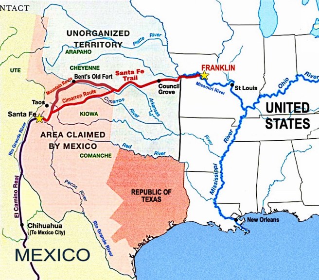 Thomas Hart Benton in his St. Louis Enquirer had continued during the early 1820s to encourage the efforts of the local fur trappers and traders commonly referred to as “mountainmen,” the most famous of which was Jedediah Smith, to continue to push ever farther up the Missouri and Platte Rivers, to explore the region in search of the most expedient route to the Pacific. Unfortunately, the Native tribes of the Blackfeet and Arikaras along the upper Missouri route stood their ground, forcing these explorers to try the Platte River valley to the Central Rockies. In 1823, a St. Louis fur trader, W.H. Ashley, followed the Sweetwater and rediscovered the South Pass, establishing the general route to the Pacific between British Canada (the 49° parallel) in the north and Mexico (the 42° parallel) to the south for what would be known as the Oregon Trail. Benton’s Enquirer celebrated the discovery of the path to the Pacific: from St. Louis to the “river Platte a short distance above its junction with the Missouri, (it) then pursues the waters of the Platte to their sources, and … crosses the headwaters of what Gen’l Ashley believes to be, the Rio Colorado of the West, and strikes for the first time, a ridge… running from north to south. This, however, presents no difficulty, as a wide gap [the South Pass] is found.” Benton’s route to the Pacific was thus discovered, with the first trader wagon train to make this voyage, financed by Astor and under the command of Captain Benjamin Bonneville, had departed in 1832. The jumping-off point from the Missouri River for the Oregon Trail was the same as that for the Santa Fe Trail, Independence, MO. Anyone wanting to travel overland to the Pacific would start at St. Louis, and take the Missouri River to Independence, where one would outfit the necessary wagon required for the remainder of the trip overland to either Oregon or Nuevo México: