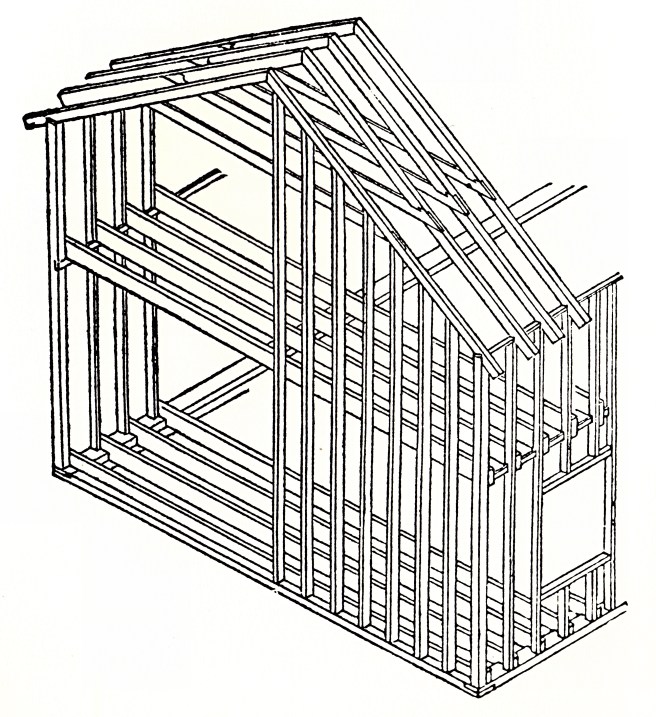 In essence, the balloon frame was a compromise between the solid bearing wall of logs used in a log cabin and the skeletal frame of widely spaced heavy timbers in a braced-frame building. While the balloon frame’s smaller studs were still arranged in a frame-like construction, the spacing between the studs was relatively small, meaning that the wall, braced with its sheathing boards, structurally acted more like a bearing wall than a true skeletal frame.