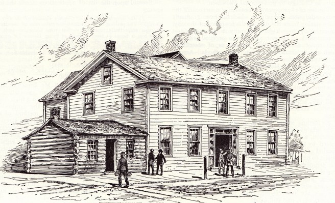 Prior to the land craze that had started in the fall of 1832, all buildings in Chicago, with a few notable exceptions, had been constructed employing log construction. Chicago historian Alfred Andreas stated that the first timber-framed building (employing columns, beams, and diagonal bracing connected with mortise-and-tenon joints) in Chicago was erected in 1828 by the Federal government for the town’s favorite Pottawatomi chief, Sauganash (also known as Billy Caldwell), at the southeast corner of Chicago Avenue and North State Street. It was not until 1831 that another framed building was erected: a two-story addition to the Eagle Inn operated by local raconteur Mark Beaubien, the younger brother of fur trapper Jean Baptiste Beaubien, that he had originally built on the southeast corner of Lake and Market, at the fork of the river’s two branches.
