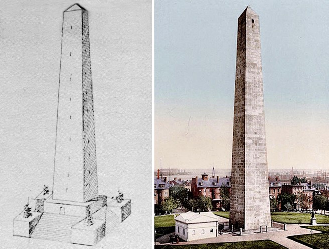 By 1823, Perkins had gained such a central position among Boston’s mercantile community that on June 7, he led a group of the city’s leading citizens that organized an association to erect a monument to commemorate the fiftieth anniversary of the Battle of Bunker Hill. Although twenty-year-old Havard student Horatio Greenough had submitted an obelisk design in the first competition, a second competition was held that chose a similar stone obelisk designed by Solomon Willard that was planned to be the country’s tallest structure at 221.’