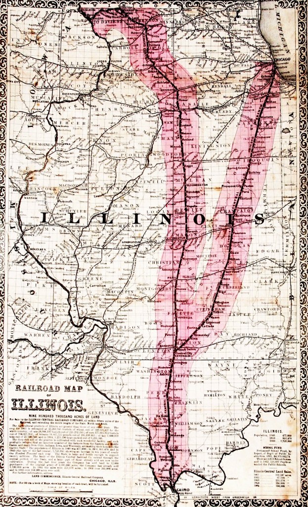 Douglas appreciated, more than most, the geopolitical advantage that Chicago would gain if it, rather than St. Louis became the intersection of an east-west transcontinental railroad with the Great Lakes and the north-south running IC linking Lake Michigan to the Gulf of Mexico, via the Mississippi River albeit downriver from St. Louis. In order to gain support for the Central Railroad from both Northeast Illinois, as well as from the northern states that surrounded the Great Lakes, Douglas added an amendment into his bill that allowed the company to build a branch line from Centralia into Chicago (that was not part of the company’s original charter that called for the line to connect with the canal at its western terminus, La Salle, before angling northwest to the Mississippi River at the Illinois/Wisconsin border) that also increased the size of the final landgrant by some 40%.