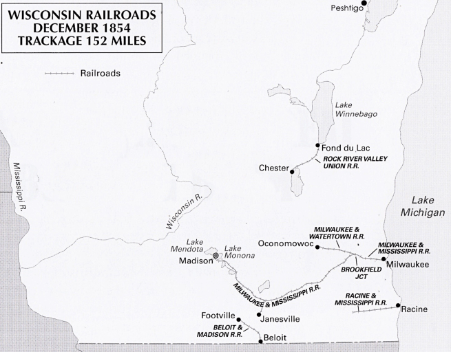 On February 12, 1851, two days after the Illinois legislature had resolved the IC landgrant in Schuyler’s favor, and five days after it had passed the revised charter of the Rock Island, it approved the charter of the Illinois & Wisconsin Railroad, with a proposed route from Chicago directly on a line to Janesville, WI, only a few miles north of Beloit. Three and a half months later on June 2 Ogden resigned as the President of the G&CU, not from exhaustion, but to assume the presidency of the infant I&W three days later on June 5, 1851. With his good friend Turner taking over control of the G&CU’s operations and further construction, Ogden began construction within a month of the I&W tracks, at almost the exact spot he had begun laying the tracks for the G&CU, some three years earlier, one block north of the corner of Kinzie and Halsted. But this time, the tracks went not to the west, but to the northwest, beginning the wall around Milwaukee. Meanwhile, a few days later at Fond du Lac at the other end of the wall, a groundbreaking ceremony was held on July 10, 1851, for the Rock River Valley Union Railroad, that began laying its tracks to the south.